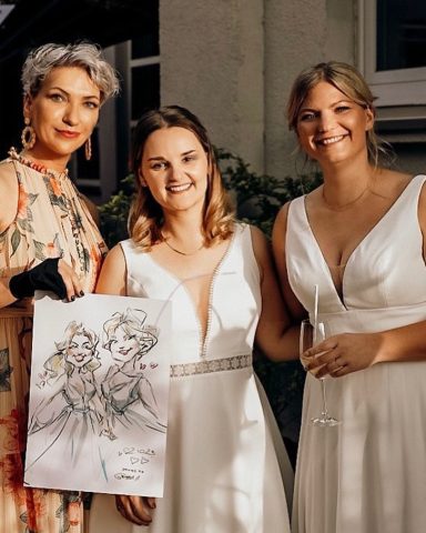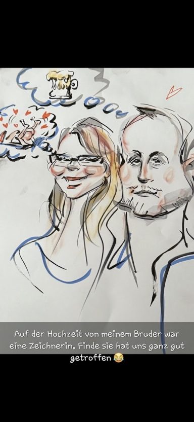 Als Schnellzeichnerin und Karikaturistin begleite ich Eure Hochzeit mit feinem Gespür für Menschen, Ausdruck und Atmosphäre.