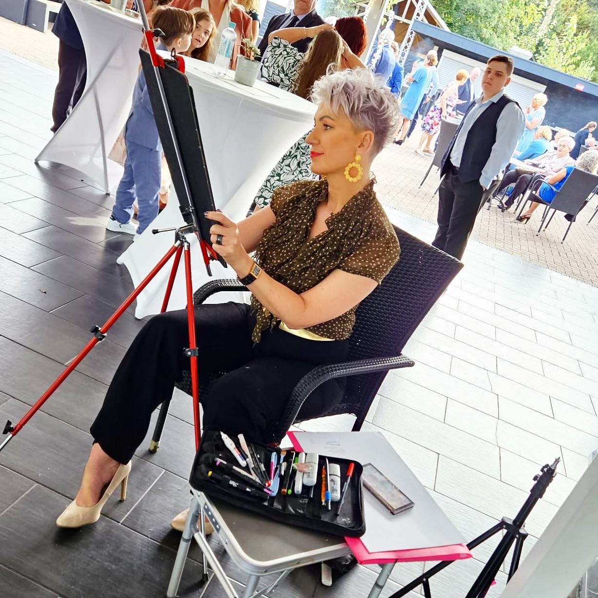 Es entstehen Gespräche, neugierige Blicke, gemeinsames Lachen. Gäste kommen miteinander in Austausch, Fremde werden zu Gesprächspartnern. Meine Arbeit wird Teil Eures Programms – lebendig, interaktiv und stilvoll.